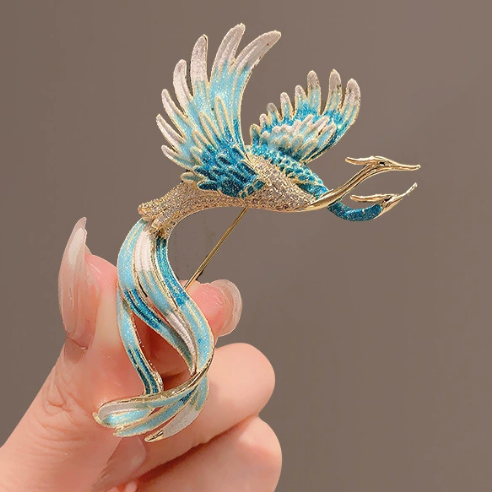 Auffällige Brosche in Form eines mythischen Vogels – ein Symbol für Anmut und Luxus. Die Flügel und der Schweif zeigen einen sanften Farbverlauf von Türkis zu Weiß, eingefasst in goldfarbenes Metall und verziert mit funkelnden Strasssteinen. Der Körper ist mit glitzernden Steinen besetzt, die die geschwungene Form von Hals und Brust betonen. Der goldene Schnabel, die eleganten Krallen und das schwarze Edelstein-Auge verleihen der Brosche Ausdruckskraft. Der lange, geschwungene Schweif mit goldenen Akzenten rundet das Design ab und vermittelt Leichtigkeit und Bewegung. Perfekt als stilvolles Abendaccessoire oder als symbolisches Geschenk.