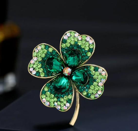 Luxuriöse Brosche in Form eines vierblättrigen Kleeblatts – ein Symbol für Glück und Eleganz. Das Schmuckstück ist mit grünen und klaren Kristallen besetzt, die im Licht funkeln und ihm einen edlen Glanz verleihen. Der metallische Stiel und die feine Verarbeitung unterstreichen die hochwertige Qualität. Perfekt als stilvoller Akzent für ein Abendoutfit oder als originelles Geschenk mit besonderer Bedeutung.